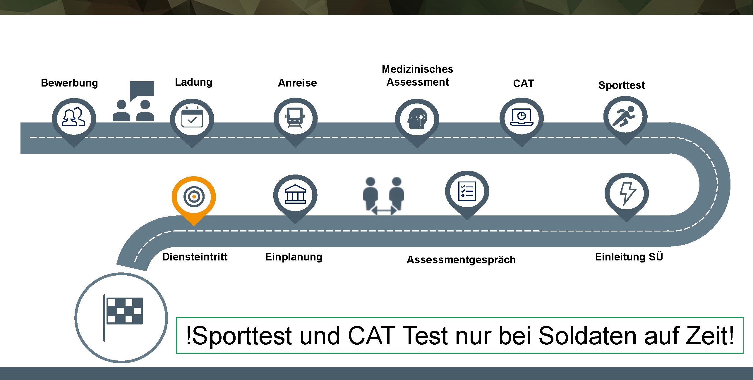 https://www.bundeswehrkarriere.de/dialog/digitales-karrierecenter/assessment-trainer vorbereiten. Außerdem können Sie sich in der Karrierekaserne https://www.karrierekaserne.de/home mit Ihren angestrebten Verwendungen detailliert auseinandersetzen. Weiterhin wird eine körperliche Grundfitness für das erfolgreiche Bestehen des Sporttests erwartet. Die Anforderung des Sporttest können Sie unter dem nachfolgenden Link abrufen Sporttest (PDF, 392,9 KB).