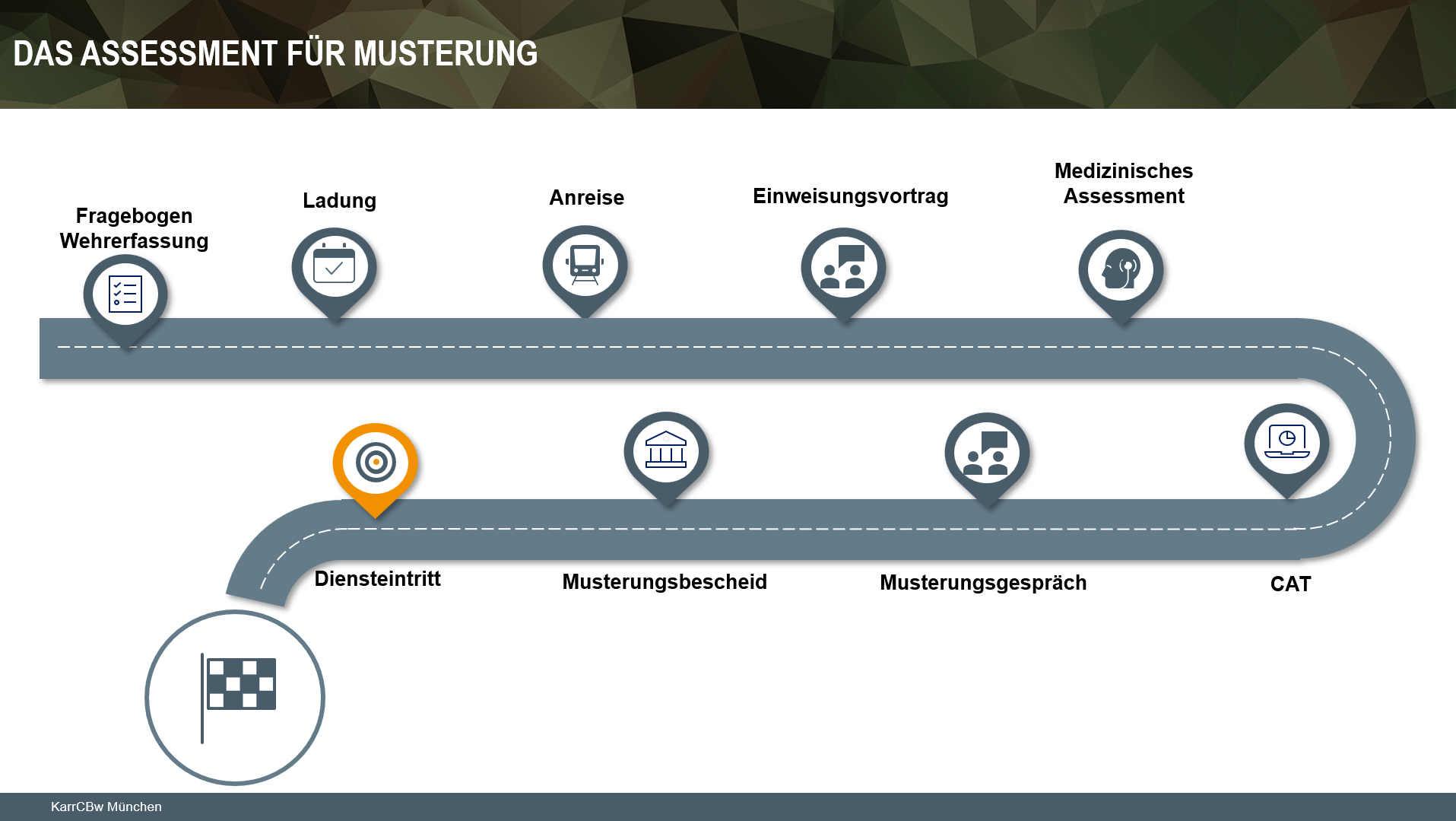 Das Karrierecenter der Bundeswehr in München ermittelt im Rahmen eines Assessments die Eignung von Bewerbenden für den Freiwilligen Wehrdienst sowie die Laufbahnen der Mannschaften Unteroffiziere und Feldwebel (inklusive Reservedienst). Die Verfahren sind verlässlich, verbindlich, verständlich und vorurteilsfrei.