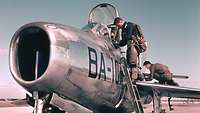 Als die Luftwaffe 1956 gegründet wurde, gab es keine Kasernen, keine Lehrpläne, keine Ausbilder, nur den politischen Willen, eine demokratische Luftstreitkraft aufzubauen. Die ersten Rekruten waren echte Pioniere. Viele hatten Kriegserfahrung, aber die neue Bundeswehr sollte anders werden: in die NATONorth Atlantic Treaty Organization integriert, demokratisch geführt und mit modernem Gerät. Wer damals Jetpilot werden wollte, musste zunächst nach Nordamerika. In den USA lernten die ersten deutschen Flieger auf Stützpunkten in Texas oder Arizona auf den F-84 Thunderjets (im Bild). Zurück in der Bundesrepublik wurden aus Schülern Lehrer. Sie mussten nicht nur fliegen, sondern eine ganze Ausbildungskultur schaffen: Handbücher schreiben, Prüfungen entwickeln, Standards setzen.