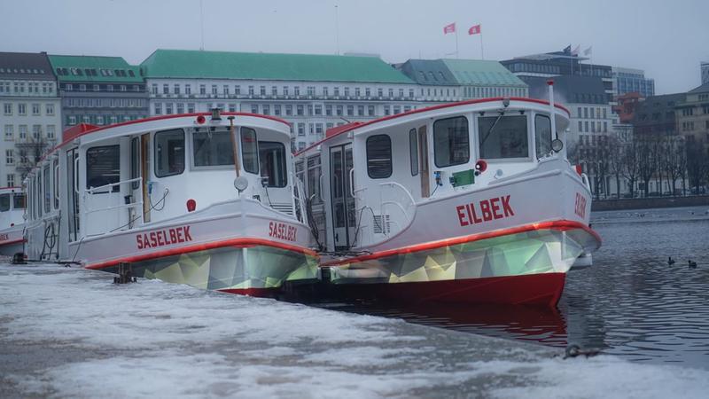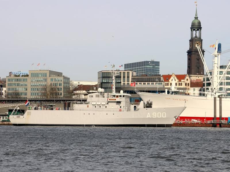The frigate Hamburg in front of the Elbphilharmonie, one of the city’s landmarks.